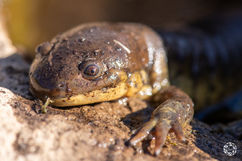 A large, stocky salamander with a broad, rounded snout, small protruding eyes, and conspicuous tubercles on the undersides of the fore- and hind feet. Adults range from approximately 7.6–16.5 cm (3–6.5 in) snout-vent length, with total lengths up to 345 mm (13.6 in). Coloration is highly variable depending on locality and subspecies, including combinations of dark spots, bars, reticulations, or plain light backgrounds in yellow, olive, gray, or cream tones. Larvae and gilled adults (paedomorphs) are aquatic, olive-gray, and possess three feathery gills on each side of the head. Some larvae may metamorphose into terrestrial adults, while others remain as large, gilled, cannibalistic morphs.